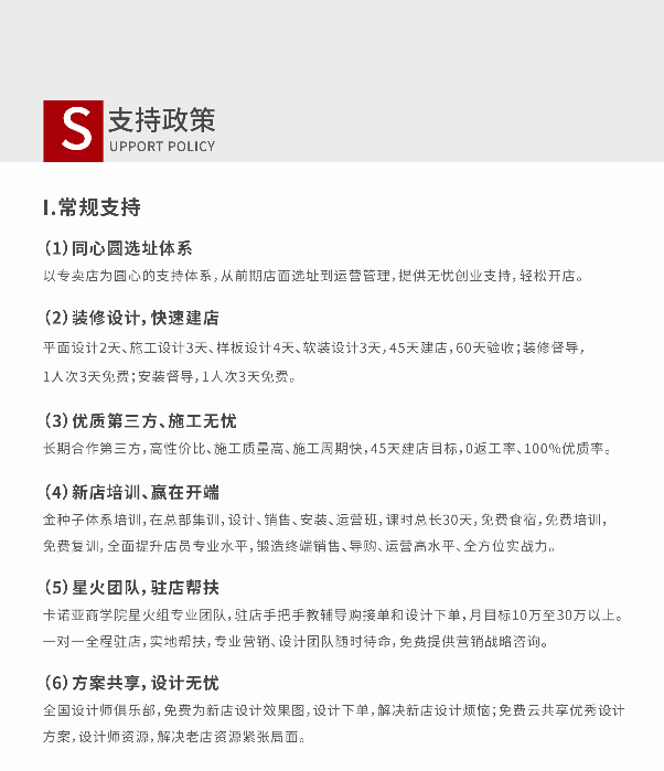 以上就是關于加盟全屋定制扶持方面的介紹了,當然每個品牌的扶持政策都是不一樣的,具體還是要以實際情況為準。加盟全屋定制選擇卡諾亞定制家居品牌,可免加盟費,送裝修,返樣板,并提供了全面的扶持政策,加盟開店全程都有專業人員為你服務,專業優秀的成熟團隊,幫助專賣店快速成長,讓投資者的店面在市場上更具優勢,獲利有所保障。 想要了解具體的扶持政策可咨詢在線客服。